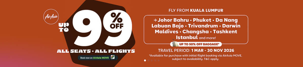 Here’s your best chance to lock in your travel plans for next year, with tickets out of Kuala Lumpur to various destinations available at 99% off the base fare until 19th October, for travel between 1st March and 30th November 2026. If you’re looking for dates after that period, you’ll have your chance in their next big sale period in early 2026. The base fare includes all fees and taxes, which are itemised, you can check these when you select your dates. You’ll also get 7kg carry on baggage, but checked baggage, seat selection and meals are add-ons.