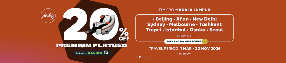 AirAsia Malaysia uses Airbus A320 aircraft to cover domestic (try Kuching, from RM88, all-in one-way) and nearby regional routes like Phnom Penh, from RM179, all-in one-way or Perth, from RM334, all-in one-way. AirAsia X Malaysia covers the longer haul routes on the network using their Airbus 330 aircraft. Apart from their economy flights, they also have a premium flatbed section which bundles your seat with luggage, seat selection and meals. During this sale, you can pick up a 20% discount on Premium Flatbed tickets.