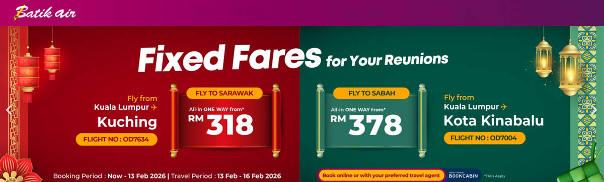The Batik Air Fixed Fares programme offers families predictable, reliable pricing on key domestic routes during what is traditionally one of the busiest travel periods of the year. Fixed fares are now available from Kuala Lumpur or Subang to Kuching starting from RM318 one-way, and to Kota Kinabalu from RM378, along with additional flights on routes, including Johor Bahru to Penang and Sibu. Travellers can also refer to the airline’s published Extra Flights for Chinese New Year schedule for more options.