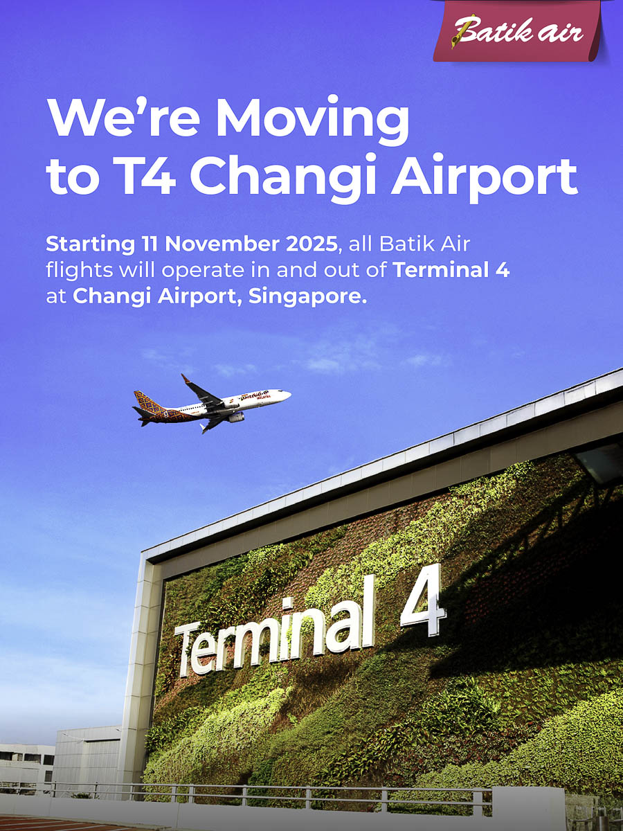 Batik Air moves to T4 Changi as part of a Group-wide Operations Shift beginning 11th November 2025. The move to Changi Airport Terminal 4 affects travellers on Lion Group aircraft, including Batik Air Malaysia, Batik Air Indonesia and Thai Lion Air. The move offers passengers a smooth, seamless journey from check-in to boarding, with automated services, unique terminal attractions and enhanced connectivity across Southeast Asia.