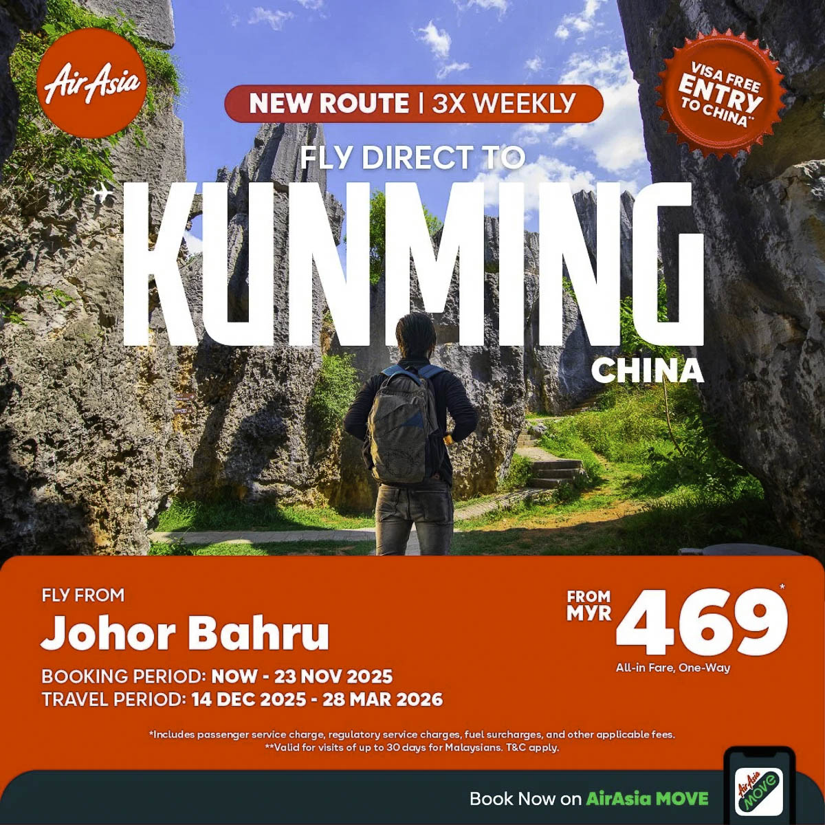 To commemorate the launch of the new route, AirAsia has special promotional fares on offer for flights from Johor Bahru to Kunming starting from RM469* all-in, one-way and from Kunming to Johor Bahru starting from CNY678* all-in one way. All flights are available for booking on the AirAsia MOVE app and airasia.com, until 23rd November 2025, for travel between 14th December 2025 to 28th March 2026. *All-in fares are quoted for one-way travel only, including passenger service charge, regulatory service charges, fuel surcharges, and other applicable fees. Terms and conditions apply.