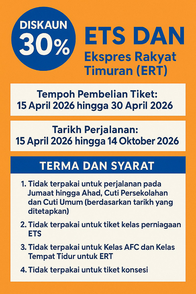 There are some restrictions to this discount offer which is not applicable during school holidays and public holidays which are periods of high demand. To enjoy the offer, travellers must purchase tickets using the promotional code found on the KTMB website by 30th April 2026, for travel period by 14th October 2026.
