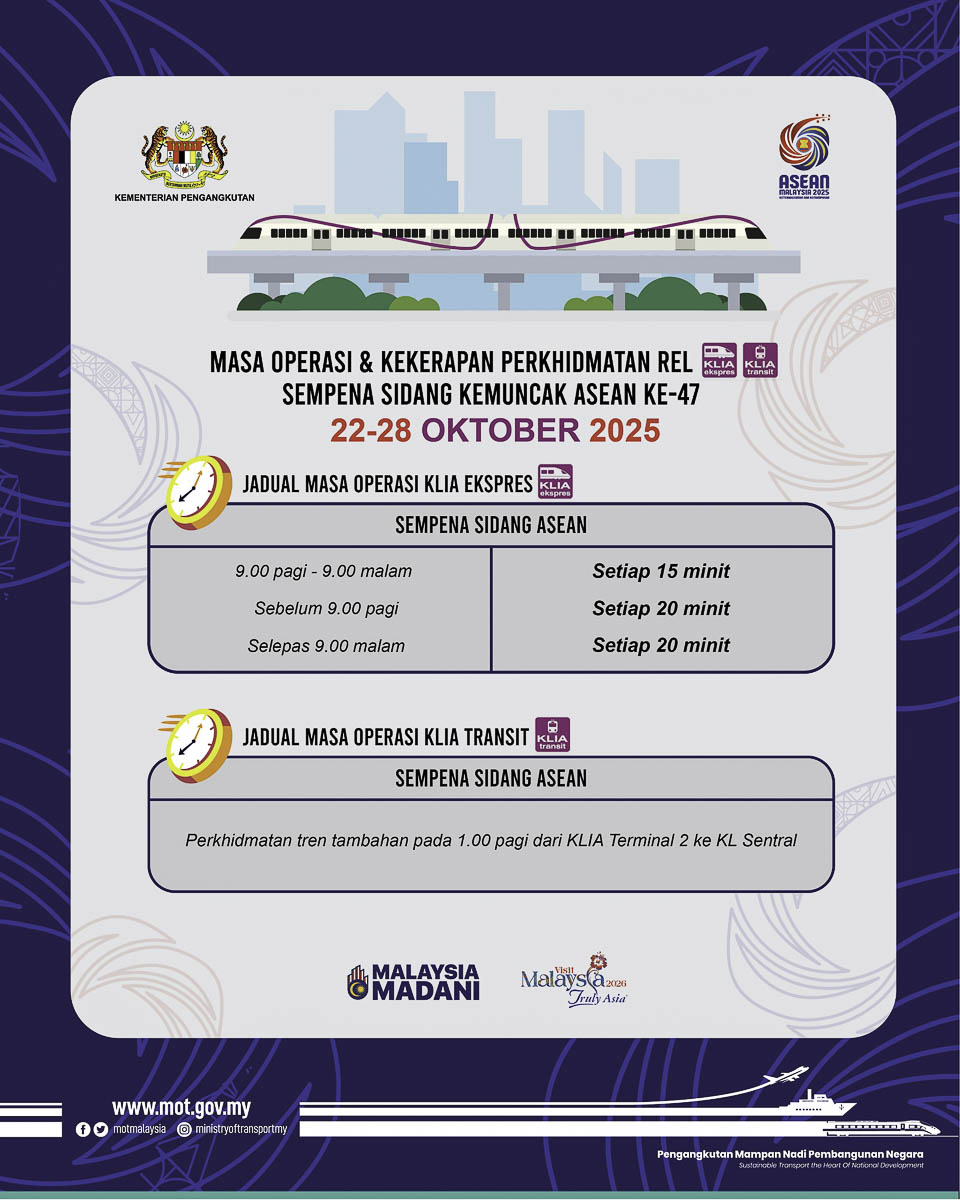 For KLIA Transit services, additional trains will be provided at 1.00 am from KLIA Terminal 2 to KL Sentral. The KLIA Ekspres and KLIA Transit timetables for the period 22 to 28 October 2025 have also been updated to accommodate the increased number of passengers during the period.