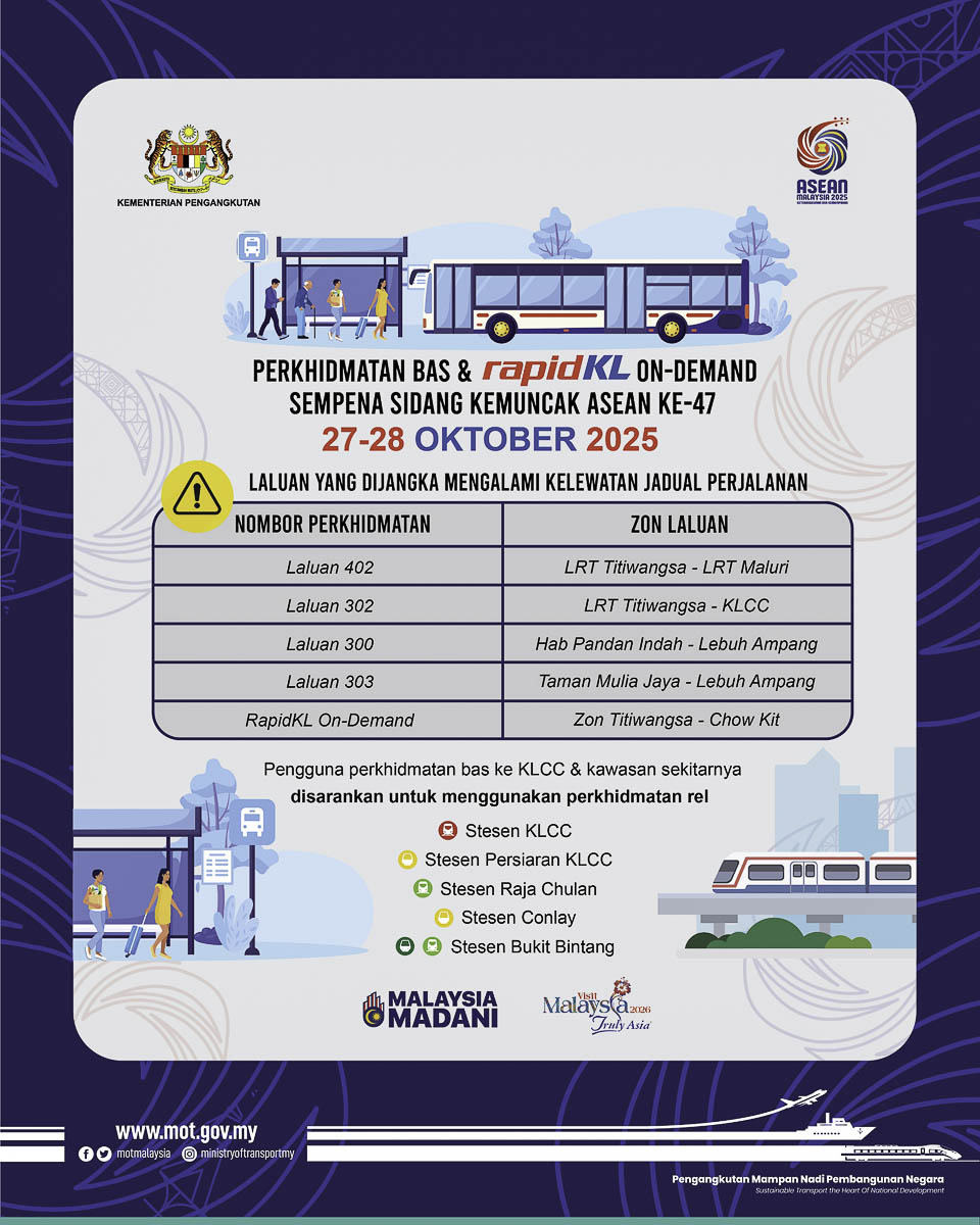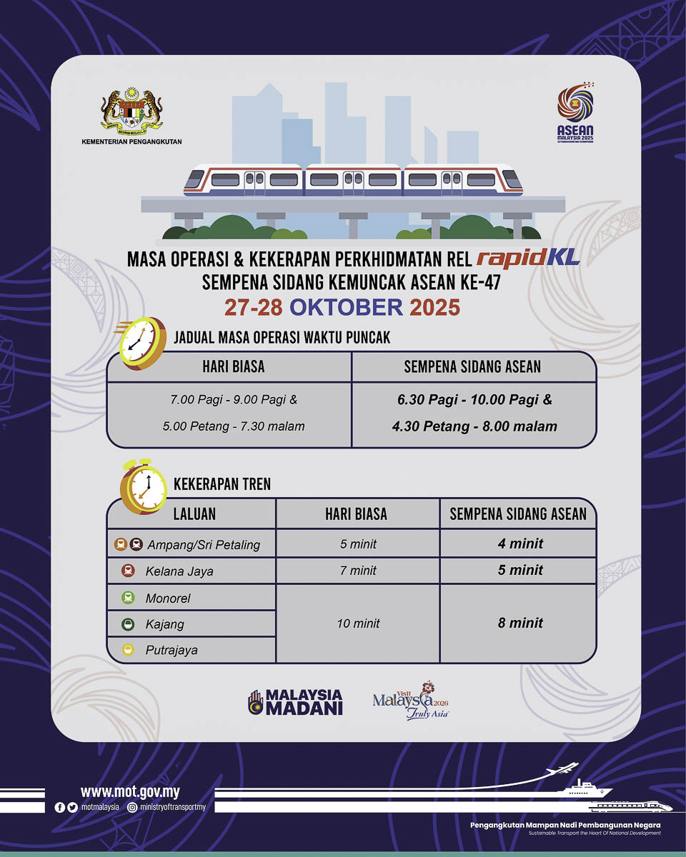 The Malaysian Ministry of Transport has advised all travellers and visitors in and around Kuala Lumpur City to use public transport for the duration of the upcoming 47th ASEAN Summit to be held in Kuala Lumpur between 26th and 28th October 2025. As traffic may also be impacted before and after the event, normal schedules will be in operation. Remember that extra demand will also mean some crowding, so allow extra time. They also have information on their Facebook page.